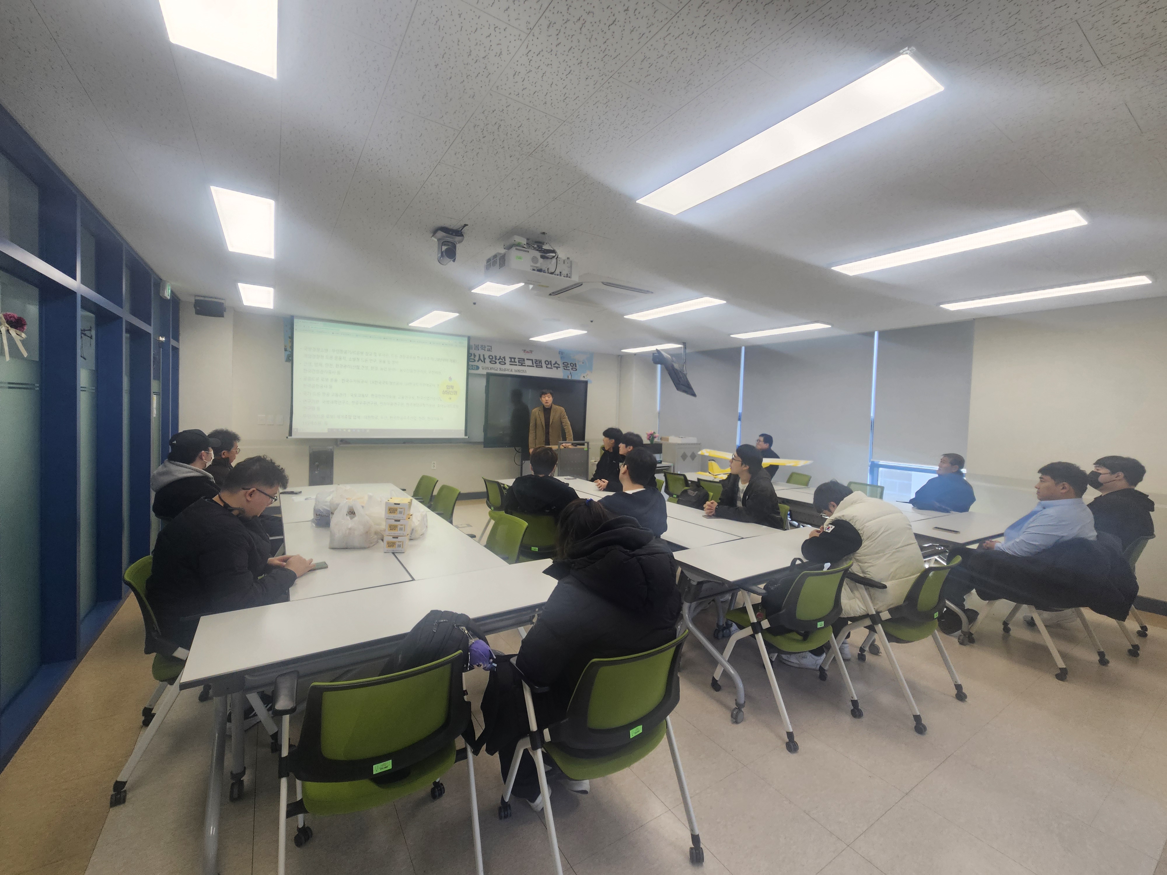 -졸업생(정희철/2025년 졸업, 남경무인항공, 교육팀 교관; 조민혁/2023년 졸업, 현재 현역 공군)을 초청하여 취업 진로에 대한 조언, 후배들이 궁금한 것 중심으로 간담회 진행함. 간담회 목적한 대로 드론 관련 최신 동향과 실무 지식을 제공하여 학생들의 현장 대응력을 강화하는 것, 드론 산업 현장의 실질적인 사례와 노하우를 공유함으로써 진로 탐색 및 취업 경쟁력을 높임, 창의적 사고와 전문성 향상을 통해 드론 산업의 다양한 분야에 대한 이해를 넓힐 수 있도록 진행하였음. 취업 관심이 있는 재학생들과 졸업생 외에도 드론로봇 관련 현업을 하고 있으신 김석주 교수님, 노준혁 교수님, 장문광 교수님, 학과장 류주환 교수님이 참여하여 현재 유원대학교 드론로봇응용학과 재학 중에 취업을 위해서 어떤 것을 준비해야 할지, 취업을 위해서 학업, 대학 생활을 어떻게 할지, 중소기업부터 대기업, 공공기관 취업 전략, 대학 과정에서 포트폴리오 전략, 졸업 후 드론로봇 분야 장기적인 진로 설계 등의 설명 등 종합적인 가이드를 제공하고, 학생들과 격의 없는 대화를 나누었음. 사전 행사로 1부에서 레이싱 드론 시연/설명(정희철 졸업생), 현업에 사용되는 방재 드론 교육(장문광 교수님), 복합센서 드론 실습교육(김석주 교수님) 등을 실외 연습장에서 진행하였음.