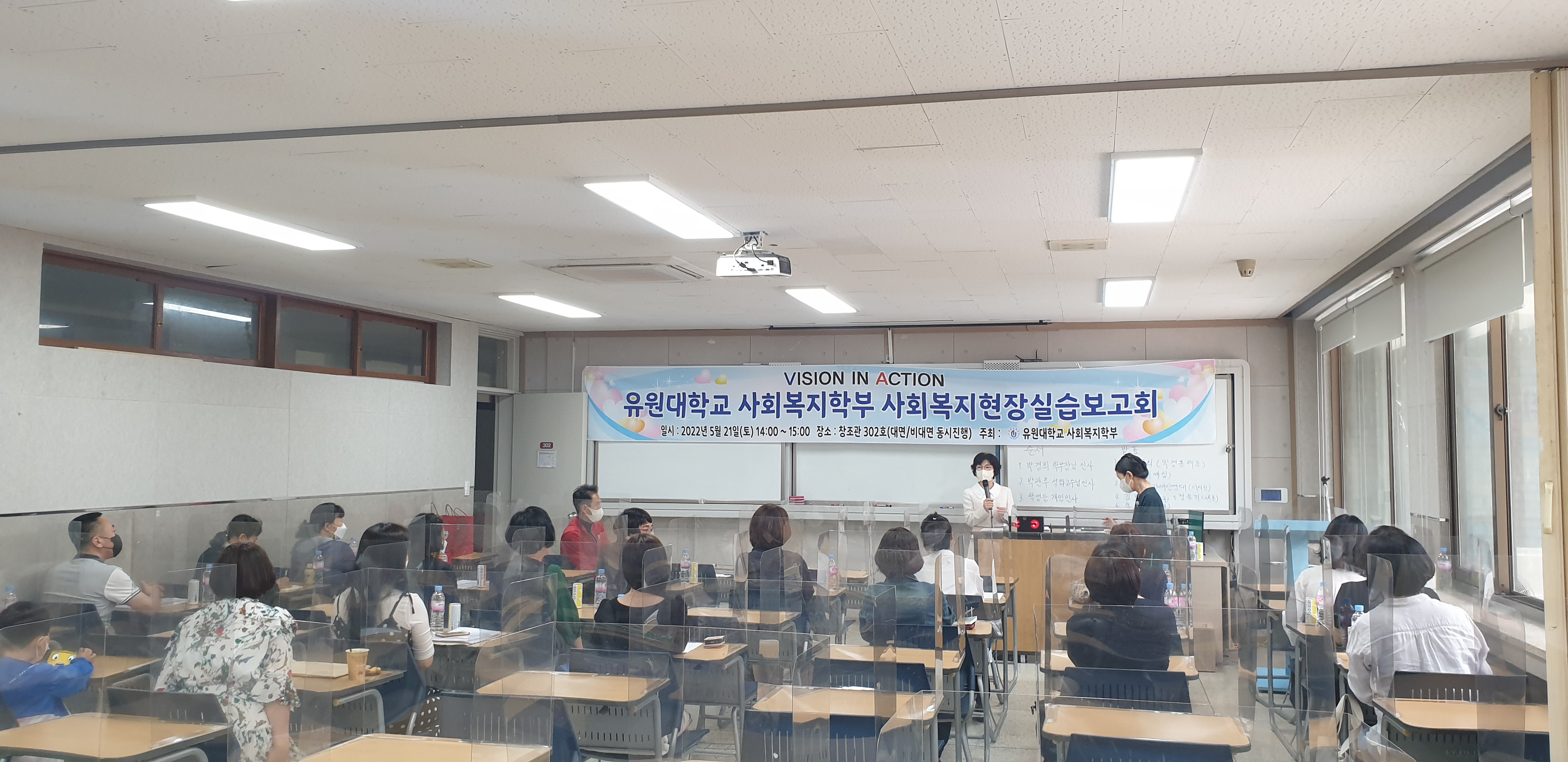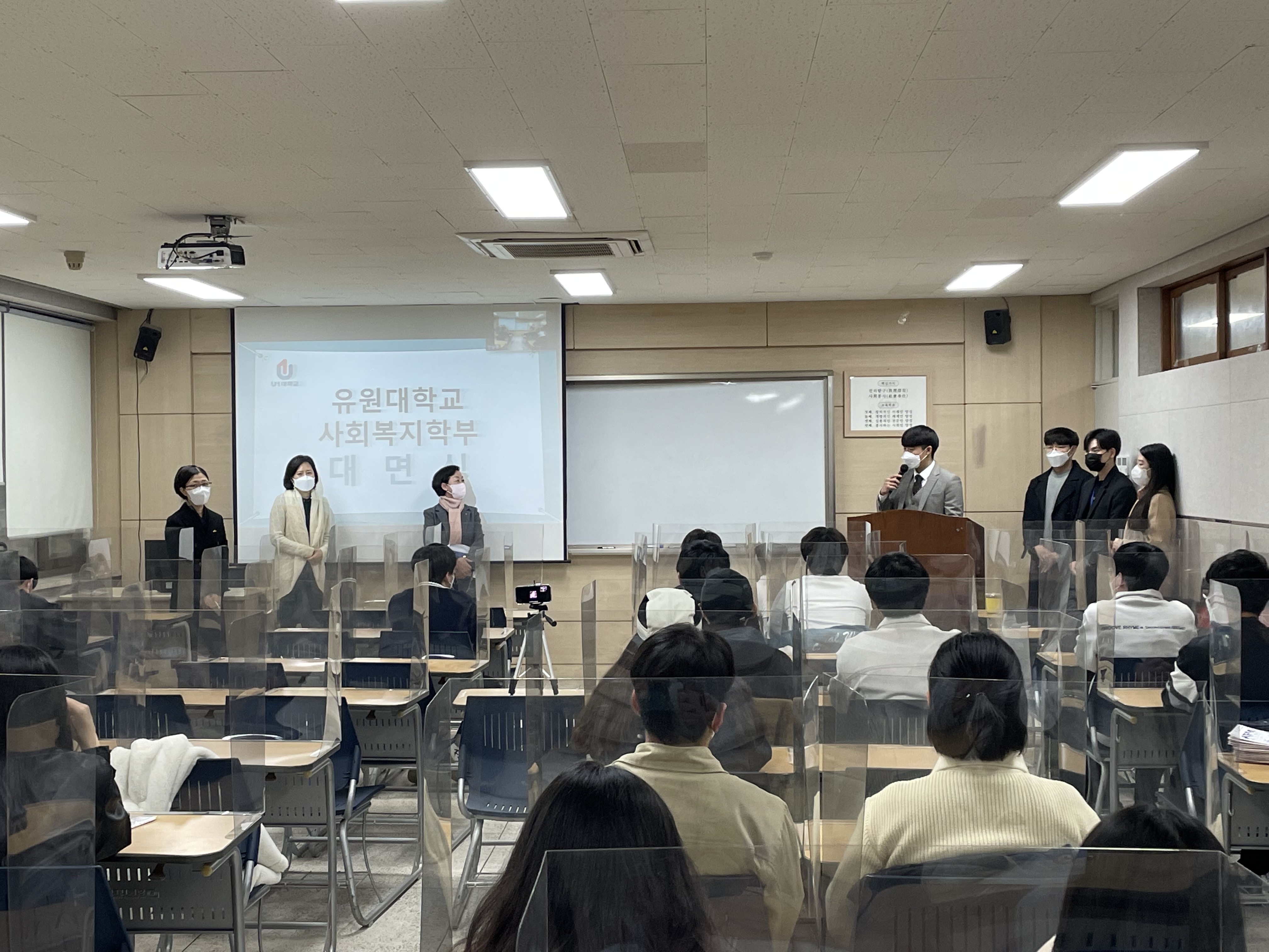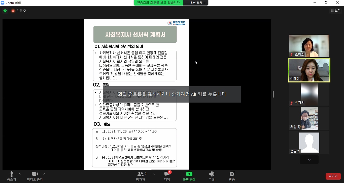 - 참여자: 오미희 교수님, 허 욱(4학년), 정수연(3학년), 최은지(3학년) - 주관: 영동군지역사회보장협의체 - 협력기관: 유원대학교 사회복지학부, 장애인복지관, 교육지원청, WEE센터 등 - 기간: 12월 6일(월) 15시 30분~16시 30분까지 : 영동읍사무소 2층 소회의실에서 '위드코로나 영동군민 마음건강 챙기기' 통합 서비스 상담을 진행하였습니다. 스트레스, 우울증, 코로나블루, 65세 이상 어르신 일상생활 체크리스트를 통해 전문가 및 사회복지학부 오미의 교수님, 재학생들과 함께 대화를 나누며 공감과 위로를 전할 수 있는 뜻깊은 활동이였습니다. - 주관: 영동군지역사회보장협의체